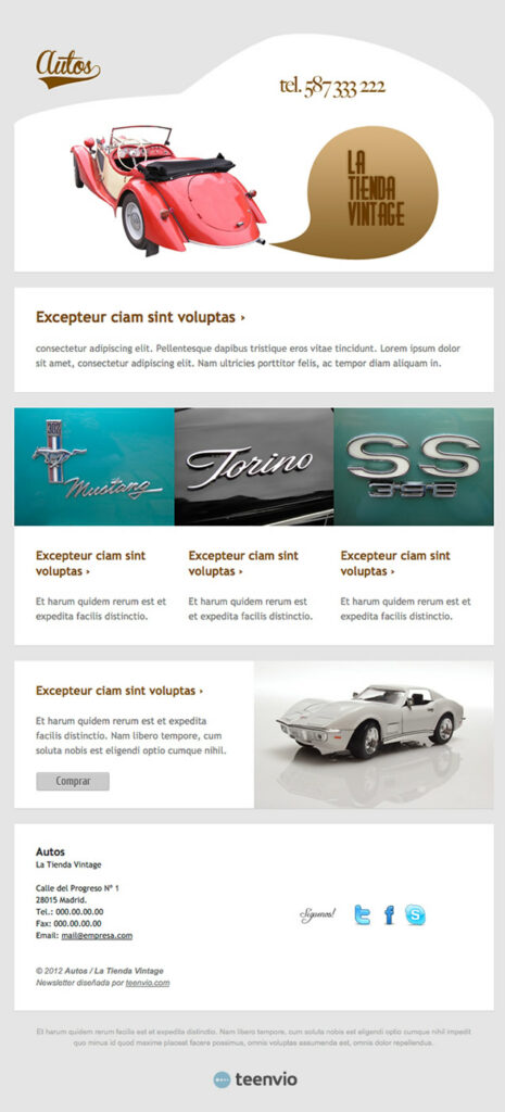 Plantilla para Newsletter Autos, descárgala gratis y realiza tu campaña de email marketing Diseñada y optimizada para su correcta visualización en los gestores de correo más utilizados (Gmail, Hotmail, Outlook,…) comienza a realizar campañas de email marketing de forma sencilla y fácil con nuestras plantillas para Newsletters. Ahora teenvio te ofrece gratis esta Newsletter con […]