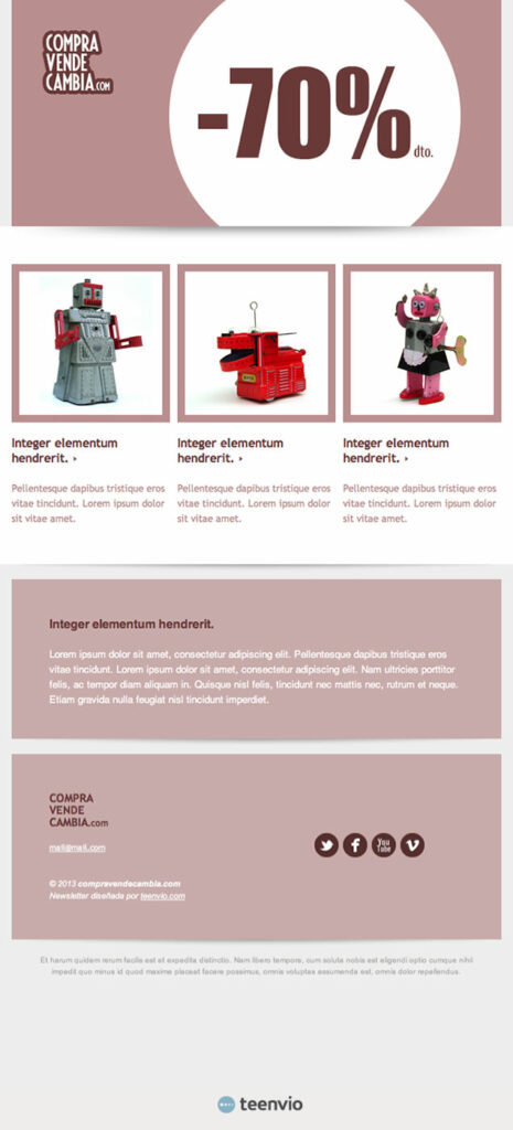 Plantilla HTML gratis Descuento, theme y template para Newsletter. Diseñada para campañas de email marketing orientadas a comercio, descuentos, promociones,… adáptala a tu empresa, producto o servicio de forma muy sencilla.