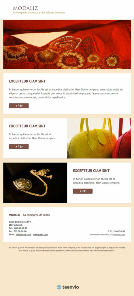 Plantilla HTML gratis Moda, theme y template para Newsletter. Diseñada para campañas de email marketing orientadas a diseño, moda y creatividad, adáptala a tu empresa, producto o servicio de forma muy sencilla.