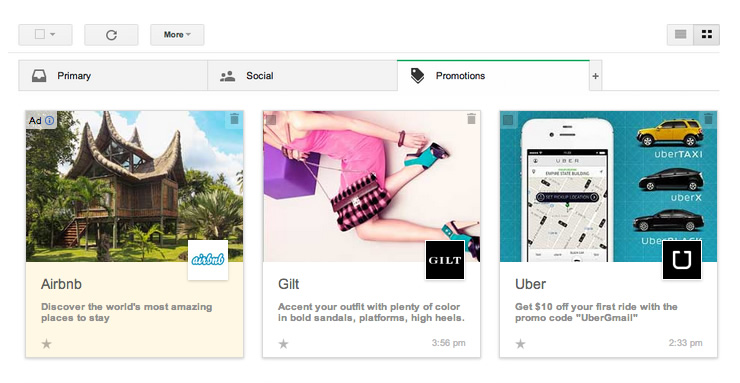 Gmail sigue haciendo pruebas en torno al email marketing y su pestaña de promociones que ahora mostrará los Newsletter en una rejilla de imágenes con mucha mayor importancia visual.