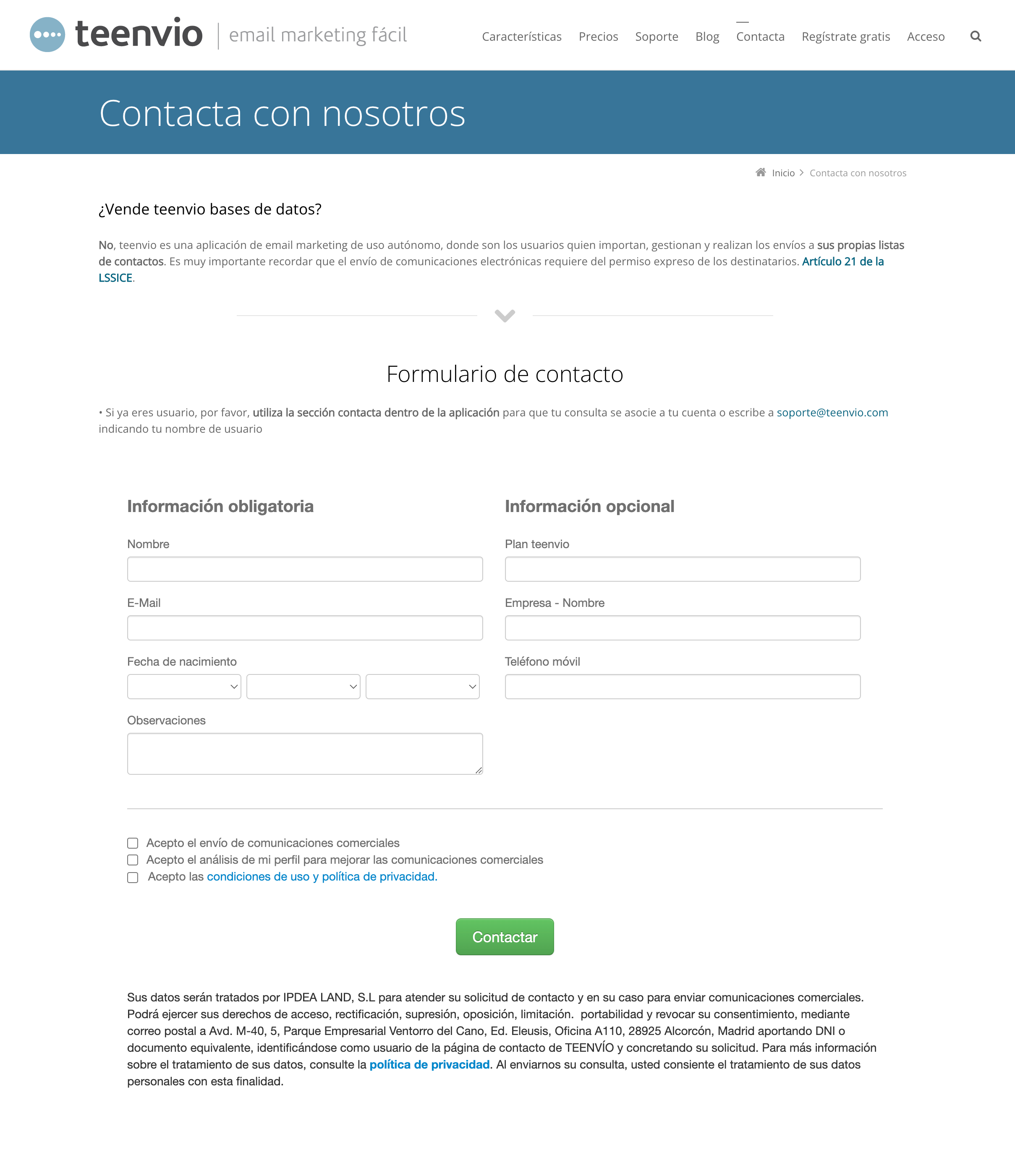 Para que esto no suponga ningún problema, Teenvio incorporará en cada formulario un check de aceptación de política de privacidad a través de la cual los usuarios darán ese consentimiento necesario para que posteriormente puedas utilizar sus datos en tus campañas y cumplas con la normativa sin complicaciones.