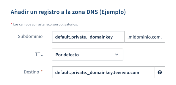 El registro DKIM (DomainKeys Identified Email) consta de dos claves, una clave pública y otra privada. La clave pública se crea en el DNS del dominio del remitente, si no se dispone de una clave pública, teenvio proporcionará una para ser introducida en el DNS del remitente, mientras que la clave privada será utilizada por teenvio para firmar digitalmente los emails enviados.